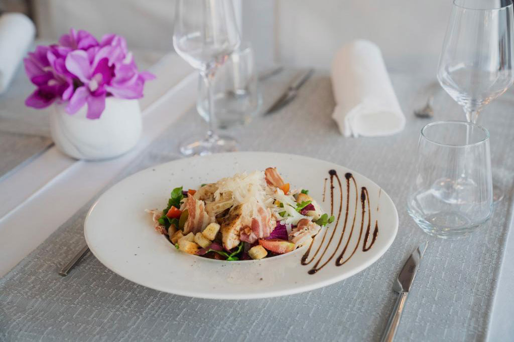 The restaurant is located very close to the renovated promenade in Kaštel Lukšić and offers a stunning view of the sea and sunsets. The cuisine has a Mediterranean flair, featuring local ingredients presented in a unique way. Our desire is for guests to feel that the food is prepared in a homemade manner! The interior of the restaurant has 44 seats with plenty of comfort, while the outdoor terrace has 50 seats. In addition to the outdoor pool, we also have a hall for weddings and any kind of celebration, accommodating up to 120 people.